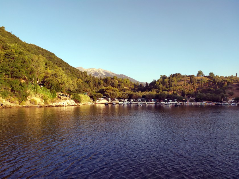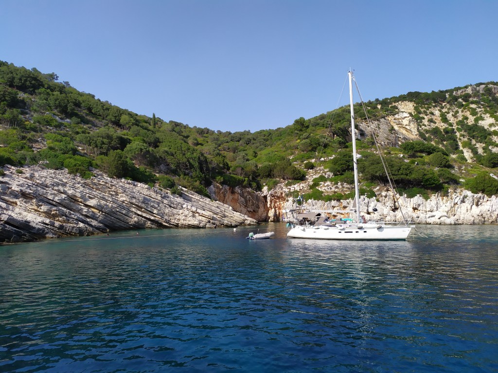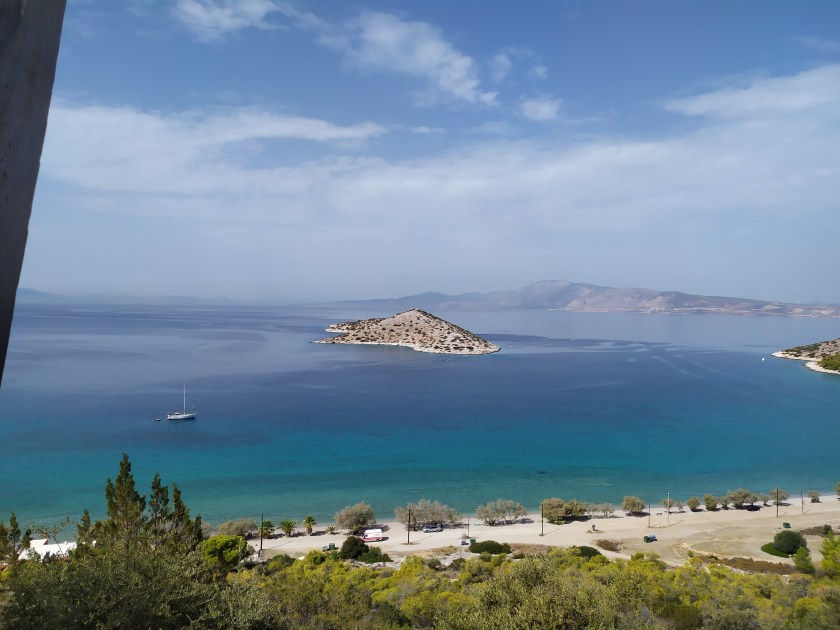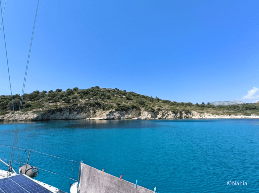 Wir huschen um den mittleren Finger rum, ankern vor ´nem Nacktbadestrand. Beim Landgang grüßt meine Crew und lächelt, in ´nem Zelt aus Schattennetzen wird gerade getafelt, da hoppelt Sousa hin und kriegt was ab. Pfade führen die Sandsteinfelsen hoch, an ´nem Plumpsklo vorbei und runter ins Örtchen Kalamitsi, wo Caféterrassen warten. Über Nacht raubt der Schwell den Schlaf, am Morgen huschen wir rüber zur Insel Drénia vor dem östlichen Finger, manche Griechen verbringen hier ´ne Nacht auf ´ner Sonnenliege am Strand, andere den ganzen Sommer, im Wohnwagen oder im Zelt, meist verborgen zwischen Büschen oder hinter Zäunen; wer ein paar Tage bleibt, gehört zur Familie.