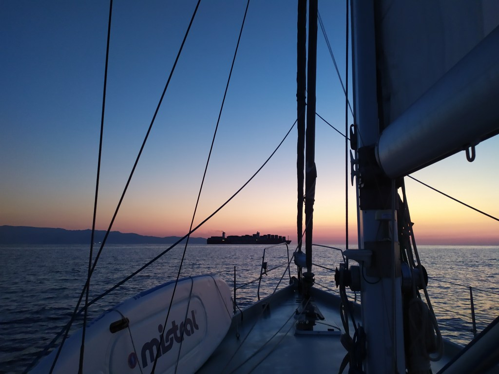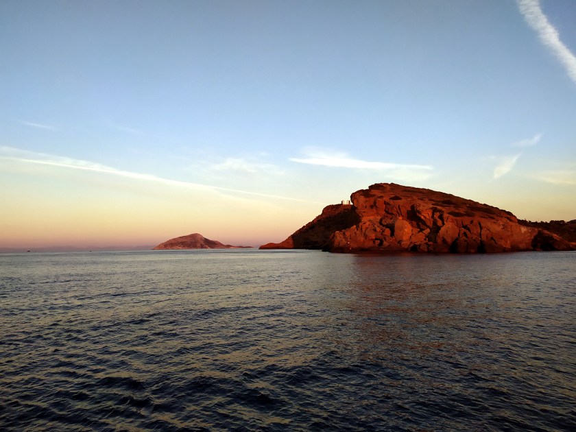 Wir tauchen ein in Schwärze, Himmel und Meer sind eins in der Dunkelheit, nur der Bildschirm meines Plotters leuchtet, im Nachtmodus, rot auf dunklem Grund. Dicht an meinem Unterwasserschiff gleiten Klippen vorbei, aus dem Meer ragende Felsen, deren Spitzen erst aus der Finsternis hervortreten, als ich die schmale Durchfahrt hinter mir gelassen hab´ und kurz nach Mitternacht der abnehmende Halbmond über der Silhouette von Sigri erscheint.