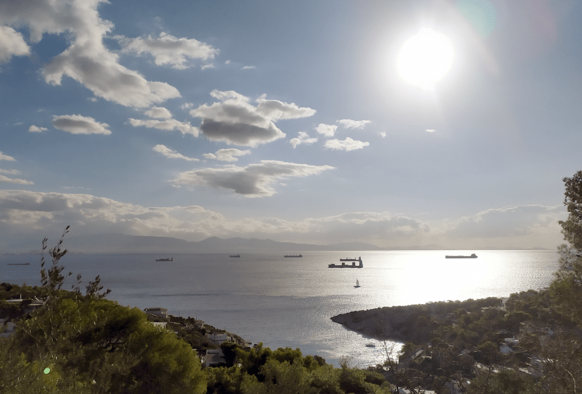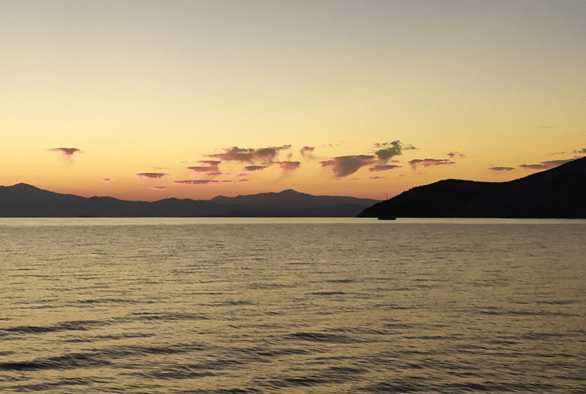 In der Nacht treffen wir zum ersten Mal auf den alles überragenden Berg Athos, mit um die vierzig Knoten rauscht der Meltemi seine Steilhänge runter, mein Käpt´n, der gerade Wache hat, refft flott meine Segel. Zum mittleren Finger hin wird das zusehends ruhiger, der Meltemi wird vom Festland nach Süden abgelenkt, in die Zentralägäis. Als das Morgengrauen nicht mehr fern und die Ankerbucht nah is´, weht ein laues Lüftchen, das ab und an zwischen an Land aufragenden Hügeln ´n büsch´n in Fahrt kommt. Segel setzen. Segel einholen, Motor an. Wieder Segel setzen. Motor aus. Bald is´ meine Steuerfrau das leid und wir dümpeln rum, bis die Sonne endlich aufgeht und die Sandflecken am Grund zu sehen sind, schließlich soll mein Anker nich´ im Seegras fallen.