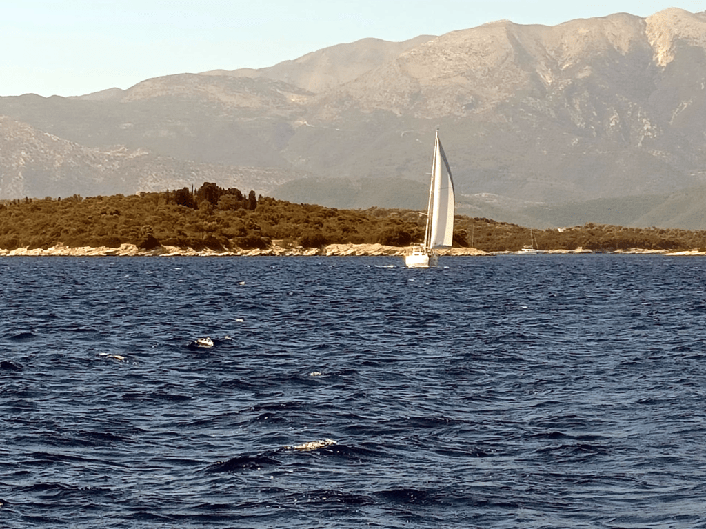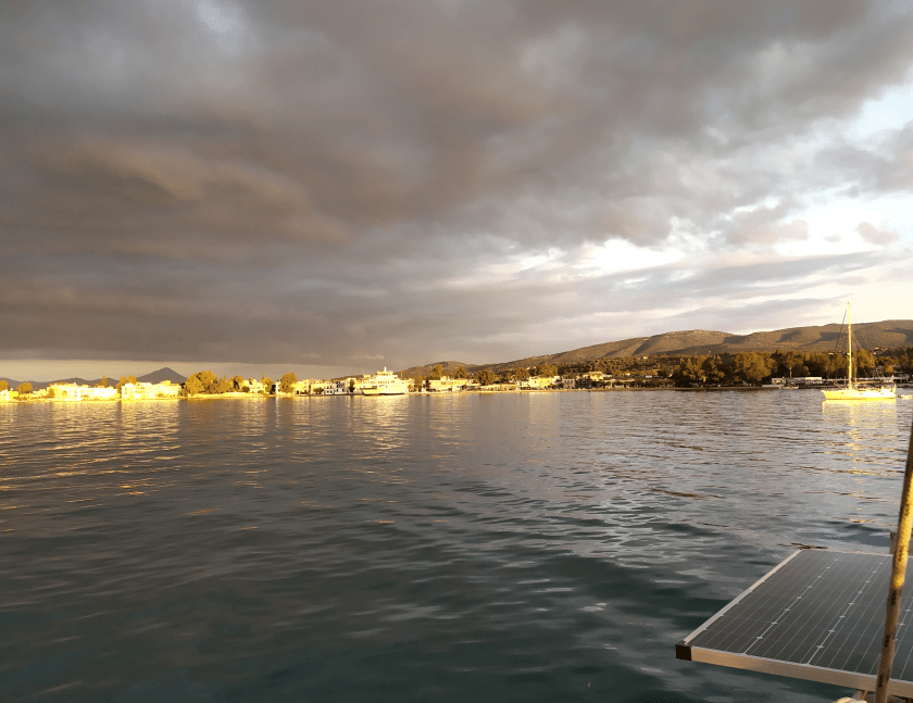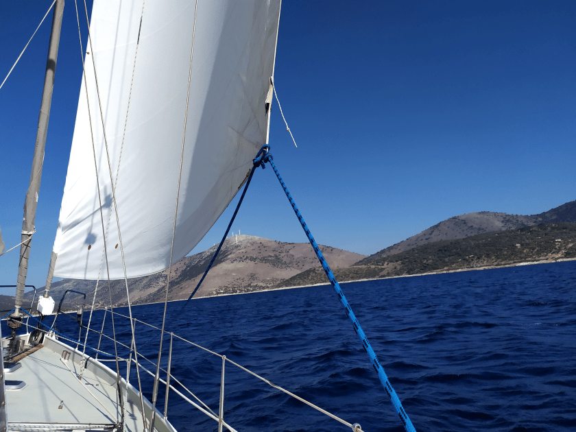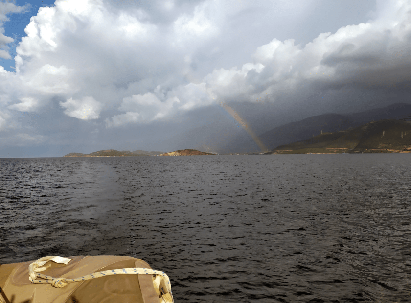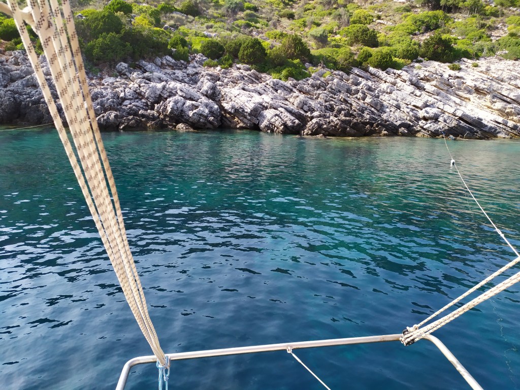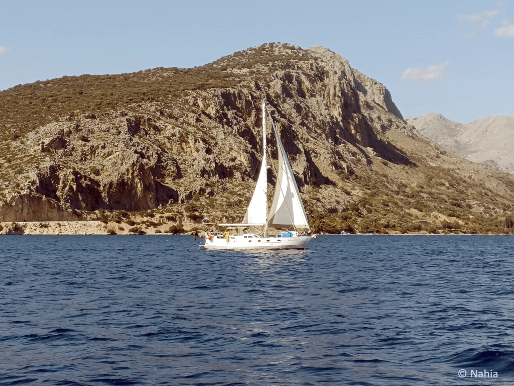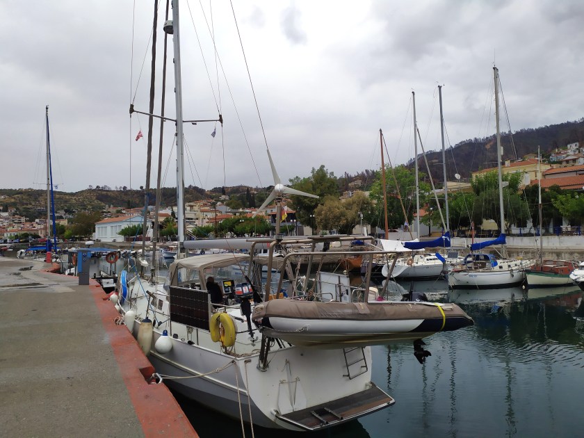 Kaum riecht das an Bord endlich mal nach „frisch gewaschen“ verdrücken wir uns nach Ormos Plateos, kurz um ein Kap rum an der Südwestspitze von Limnos. Nach ´n paar Tagen wird der Meltemi übermütig, die Windsurfschule macht Pause und Sousa muss ihr Geschäftchen auf meinem Deck erledigen. Meine Crew checkt die Wetter App, am nächsten Tag soll das noch stürmischer werden, und zwei Wochen lang so bleiben. Segelurlaub ohne Baden? Mit sturmzerzaustem Haar in der Plicht hocken? Das soll unserem Besuch erspart bleiben, ich werd´ klargemacht zum Anker lichten.