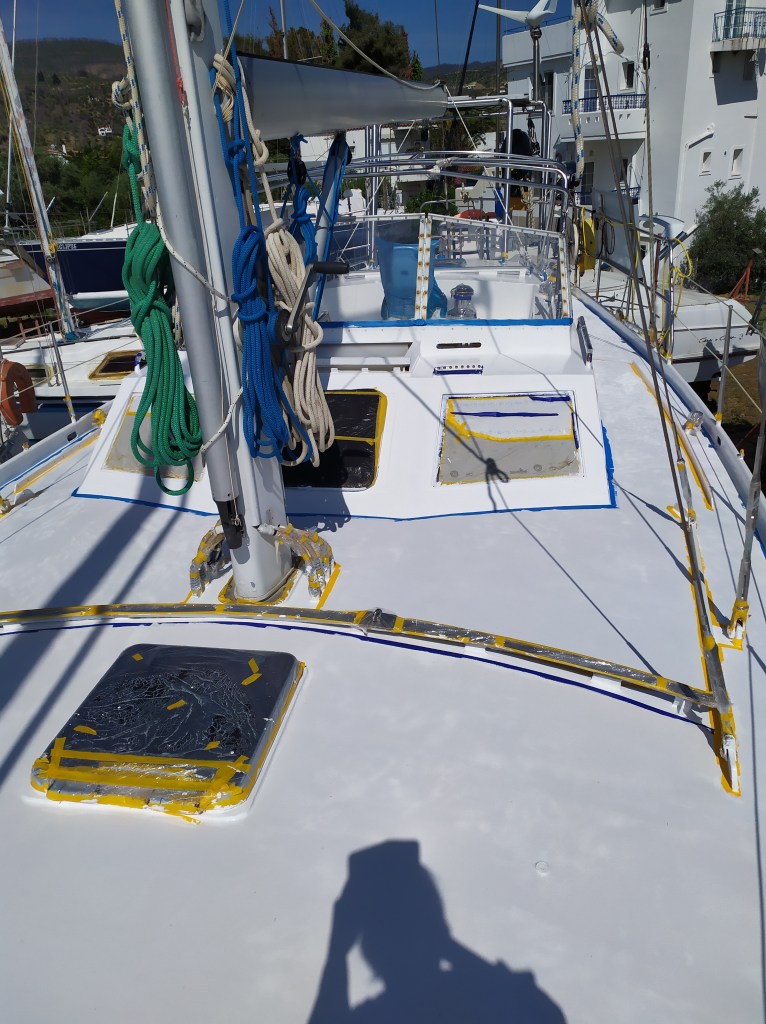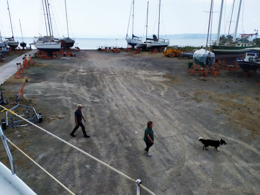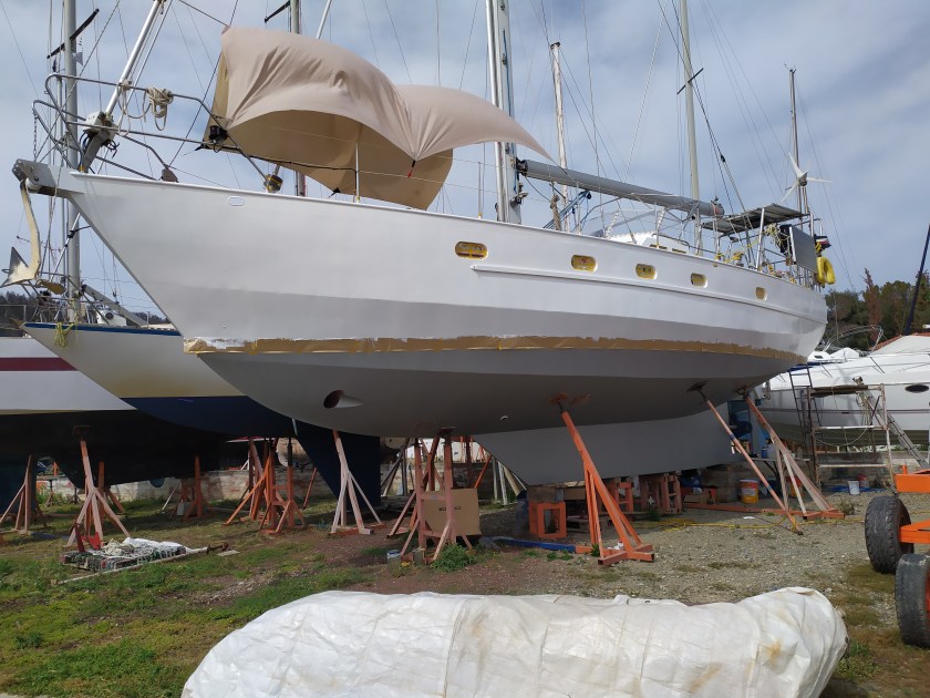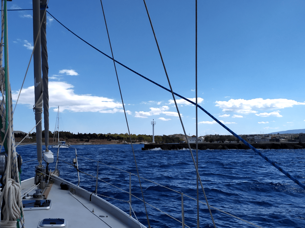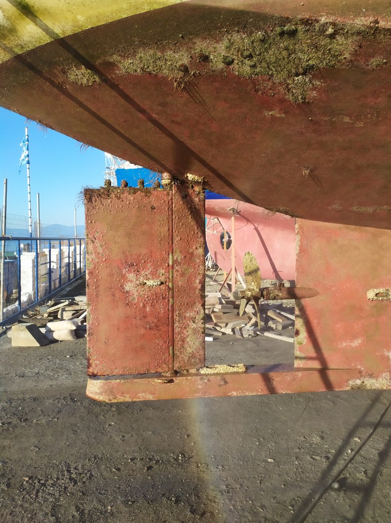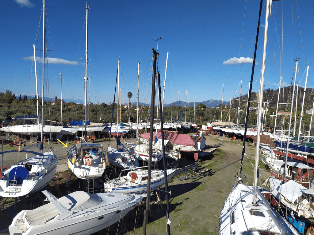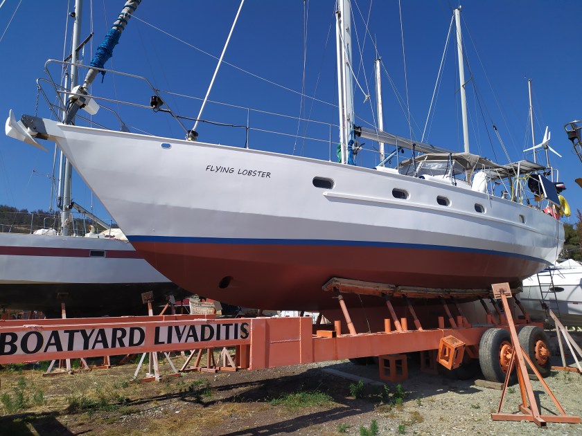 Mitte September werde ich in Nea Peramos aus dem Wasser gehoben. Nu´ steh ich Land, aufgebockt und eingepfercht zwischen anderen Yachten. Lieber wär´ ich dicht am Wasser, da, wo die Sonne auf den Wellen tanzt, wo der Wind mit dem Meer singt und der weite Horizont mich ruft, da fühl´ ich mich sicher.