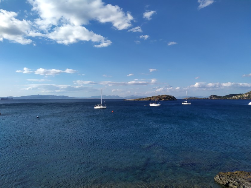 Das is´ August und noch wohlig warm, jeden Nachmittag strebt der thermische Südwind zum aufgewärmten Festland hin, beschert entspannte Segeltörns. Nach Nea Marmaris, von aus dem Marmarameer vertriebenen Griechen 1922 gegründet, oder Diaporti, wo man nichts als gut bestückte Schapps braucht, und vielleicht ´ne Badehose. Von Diaporti in die rundum geschütze Bucht von Porto Koufo, der Anker fällt auf zwanzig Meter und greift nich´ gut, da Flaute herrscht is´ uns das eins.
