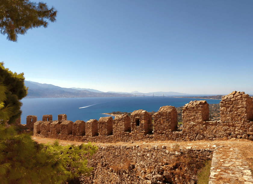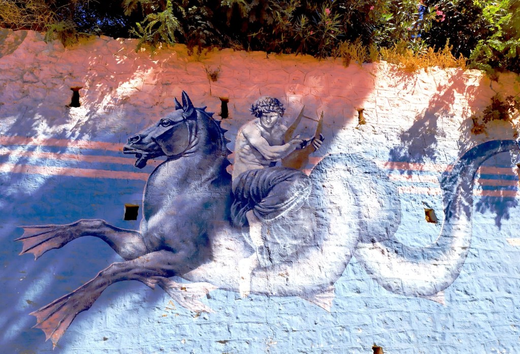 Der Meltemi schwächelt, das is´ noch Platz in der weiten, recht gut geschützten Hafenbucht, über die eine zur Ruine zerfallene Burg wacht. Das Meer hat mir geflüstert, dass es Kriegsgaleeren verschiedenster Völker hierher getragen hat, die Burg von Mirina wurde einst von Byzanz auf den Ruinen einer antiken Akropolis errichtet, später bauten Venezianer und Osmanen weiter. Kurz vor Sonnenuntergang hüpft Sousa den gepflasterten Weg zur Festung hoch, ein Rudel kleiner Hirsche springt am Hang lang, huscht hinter Felsen. Abends füllen sich die Tische der Restaurants am Kai des kleinen Fischerhafens und nebenan, in der von Souvenirlädchen bevölkerten Fußgängergasse, herrscht beinah hektisches Gedränge, bin froh, dass ich am anderen Ende der Bucht liege.
