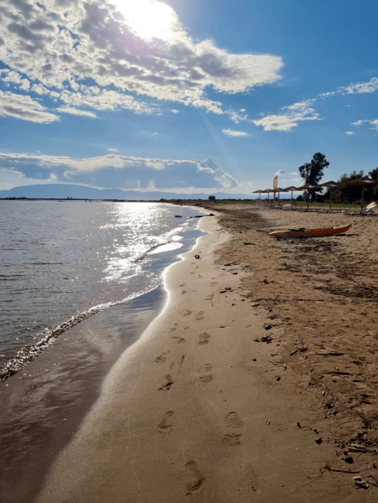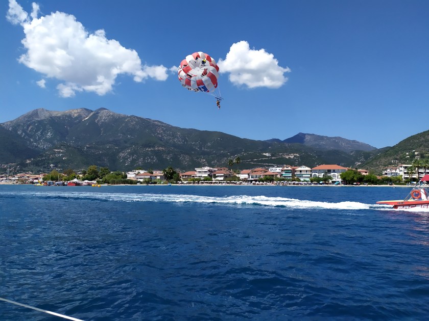 Auch unser Besuch aus der Pfalz hat „Tschüs“ gesagt, meine Crew macht sich im Morgenlicht auf Weg zur Insel Thassos. Nochmal ein langer Schlag, nonstop um den östlichen Finger rum, die Küstenwache jagt jeden weg, der an den Ufern vom Berg Athos ankert. Gegen Mitternacht gräbt mein Anker sich vor Potos, an der Südküste von Thassos, in Sand. In der weiten Bucht von Limenaria genießt meine Crew die letzten Tage Bootsleben, Ruthie paddelt mit Sousa zu ´nem lütten, wilden Strand, wo ´n Pfad die Uferböschung hoch in ein Kiefernwäldchen mit Meerblick führt; mein Käpt´n hockt inner Plicht, träumt davon, dass der Sommer nie aufhört.