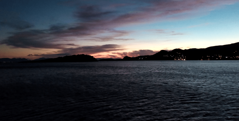 Die Lichter des Örtchens verschwinden hinter den Felseninseln, der Südwind erhebt sich, weht verhalten aber stetig, bis auf halber Strecke nach Limnos mein Motor ran muss. Das Windloch währt nich´ lange, bald rauscht der Meltemi aus Nordost heran, pustet von querab in meine Segel und schiebt mich gen Mazedonien. Auch die Strömung von den Dardanellen her kommt aus Nordost, aber die bringt mich vom Kurs ab, deshalb hat meine Crew schon beim Aufbruch in Sigri ´nen nördlicheren Kurs gesetzt, um den berechneten Versatz auszugleichen.