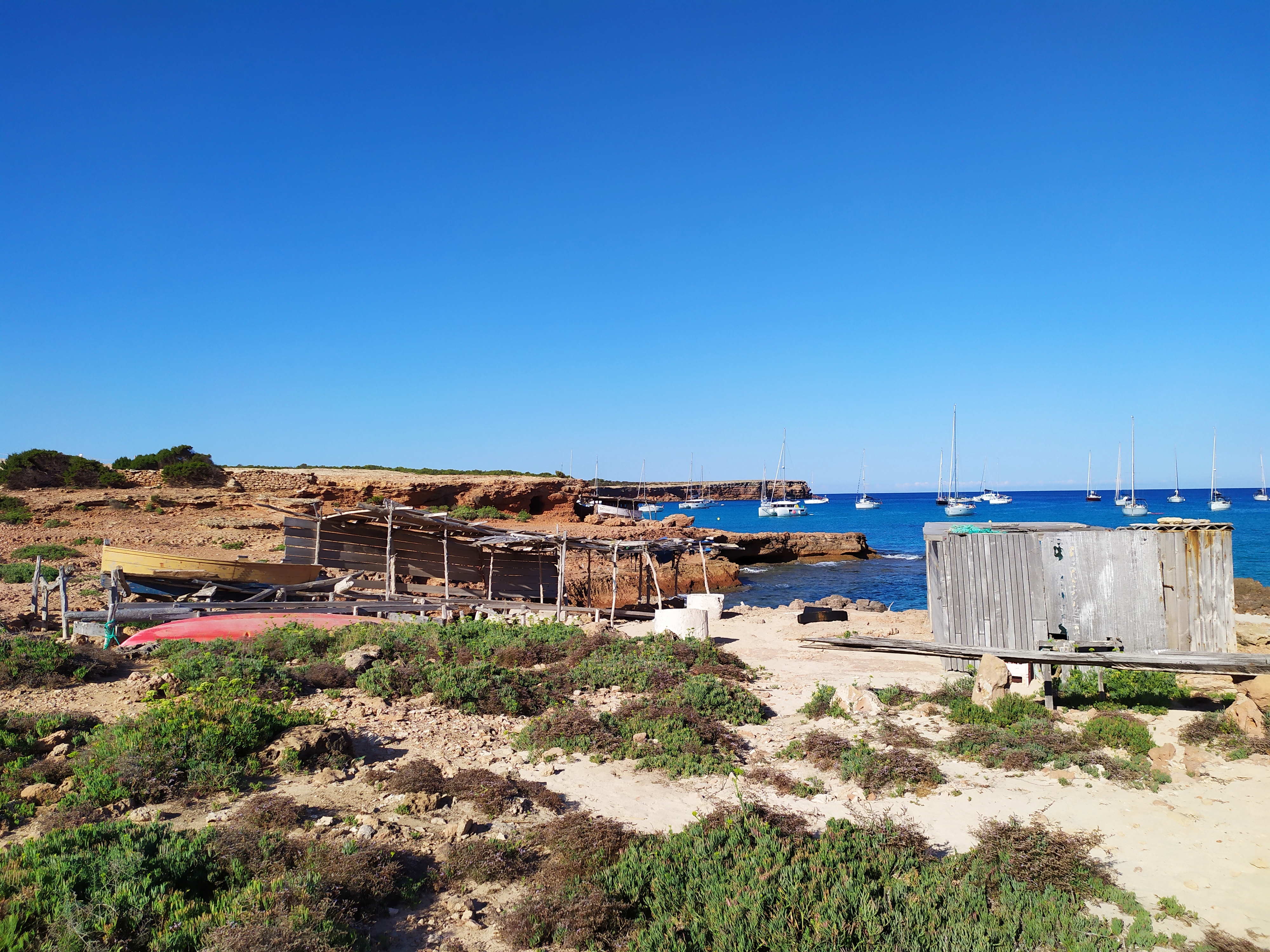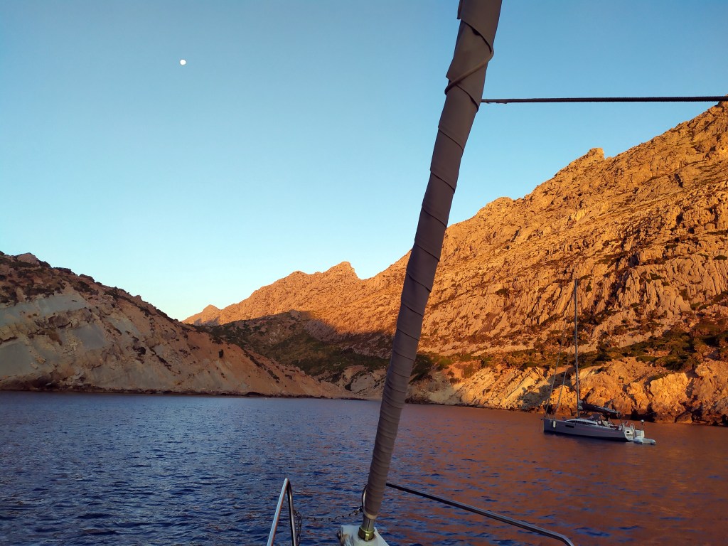 Nachts lieg´ ich ruhig wie auf einem Bergsee. Vor dem Frühstück will meine Steuerfrau allerdings Brot einholen. Mit dem Dinghi schippert mein Käpt´n sie zur nördlichen von zwei schmalen Einbuchtungen im Fels. Im Nu steigt sie eine Treppe hinauf, die zu einem weitläufigen Hang führt. Immer dem Duft der Macchia nach. Thymian. Wilder Fenchel. Garrigues. Agaven ragen zwischen vereinzelten Felsen auf. Von der Sonne verdorrte Kardonien und Bauruinen säumen den Weg. Ein Mann pflügt sein Feld. Die trockene Erde wirbelt auf und lässt seine Silhouette verschwimmen. Was kämpft er der Erde ab? Kartoffeln, Kapern oder Kohl? Zucchini, Artischocken oder Tomaten? Auf einem anderen Feld stehen Weinstöcke in Reih und Glied. Und auf der Höhe angelangt gibt eine weite Schlucht den Blick auf verstreute Sandsteinbrüche am gegenüber liegenden Hang frei. LKW kommen und gehen, ziehen Staubwolken hinter sich her. Ein Dorf ist nirgends zu sehen.