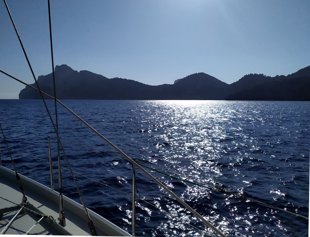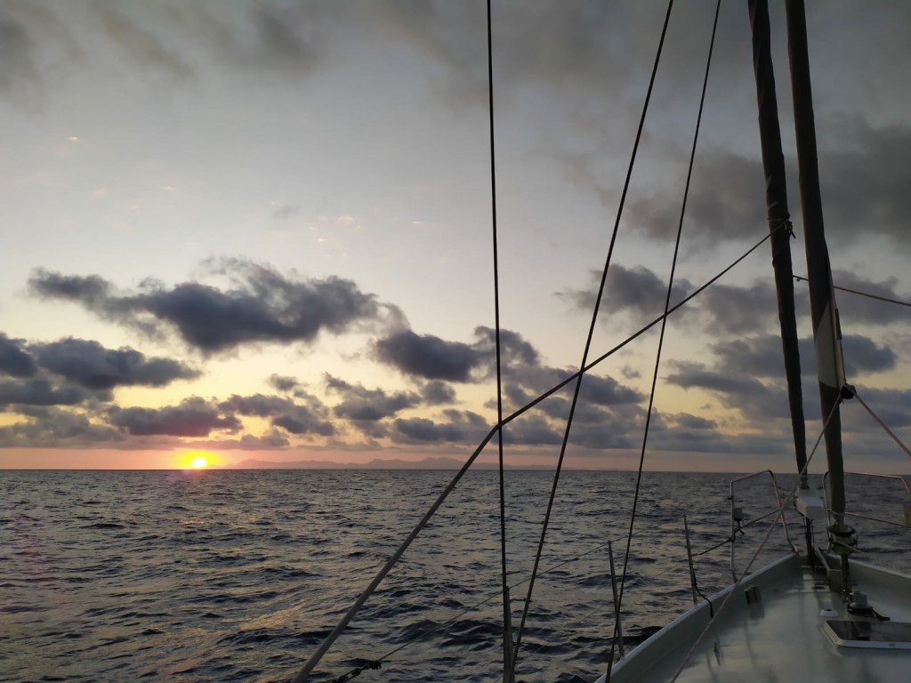 Zum Kap Spartivento brechen wir am frühen Nachmittag auf. Mal rausche ich unter Segeln über die See, mal tucker ich mit Motor. Die Silhouette des Ätnas trotzt dem flammenden Himmel. Raucht zahm vor sich hin.