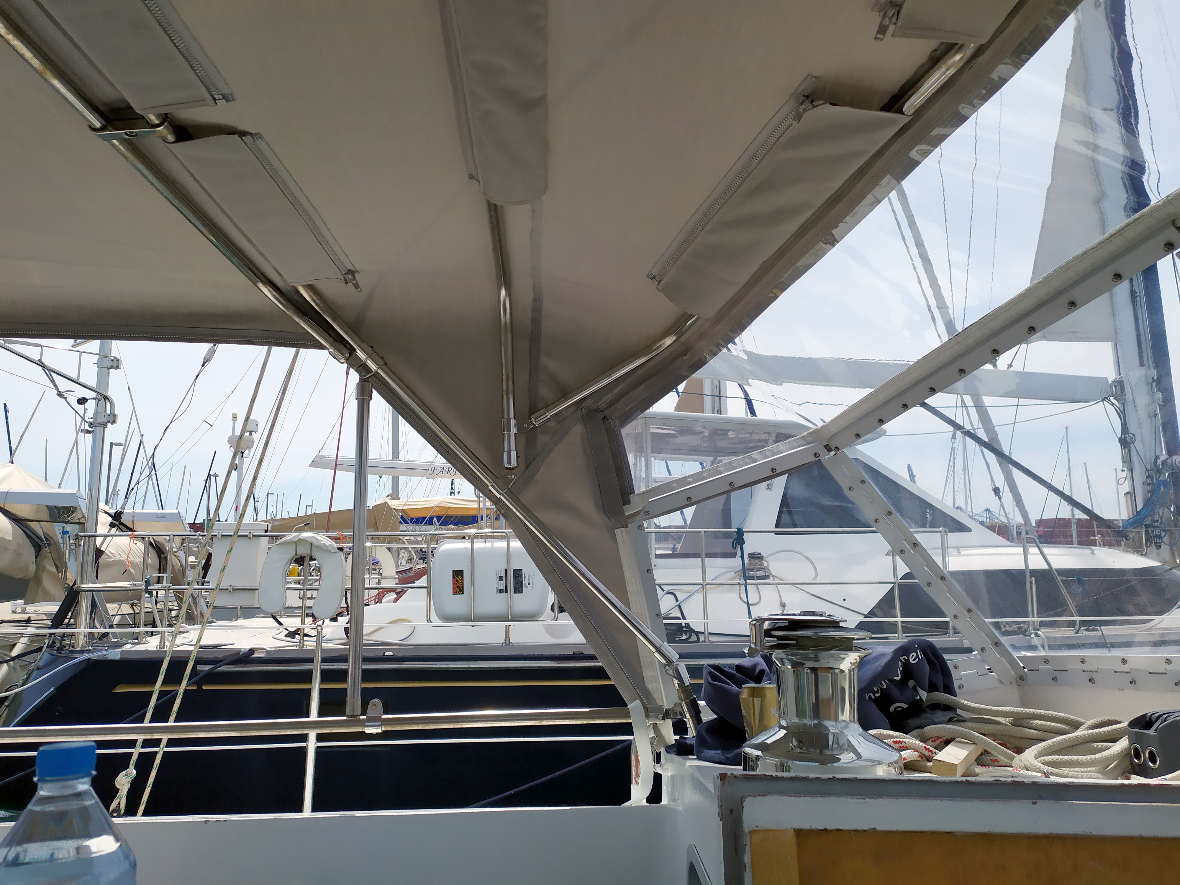 Über zwei Monate lang hat meine Crew an mir rumgepusselt. Das brauchte ich man aber auch! Unter anderem ist mein Getriebe nu´ überholt, achtern hab ich ´ne höhere Reling aus Edelstahl mit schwenkbaren Solarpaneelen dran und meine Genua ist repariert. Und mein Beiboot hat ´nen Überzug bekommen! Der griechischen Sonne eilt nämlich der Ruf voraus, dass PVC ihr nicht lange standhält.